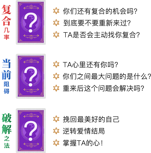 内容有当前对方想法、存在的问题、是否能够复合,同时也有对应的化解方法,个人觉得非常实用准确,推荐!